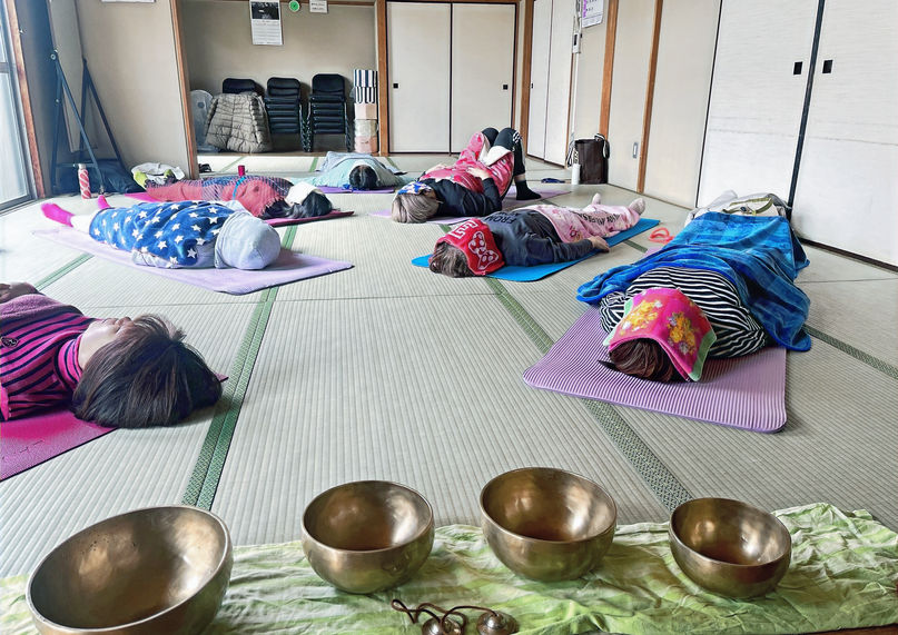 シンギングボウルの美しい音色と振動が体を包み込み、